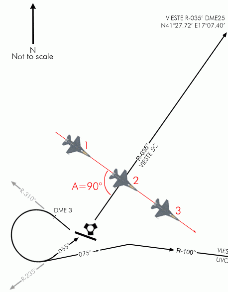Jakmile víš, kde jsi a víš, který radiál potřebuješ zachytit je potřeba, abys letěl směrem k imaginární lince zobrazující v prostoru radiál. Nejkratší trasa k zachycení tohoto bodu je letět v kolmém (90°) kurzu k této lince. S tímto kolmým kurzem dosáhneš radiálu velmi rychle, ale budeš mít dost potíží provést hladké zachycení, protože CDI přejde z jedné strany na druhou velmi rychle.