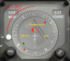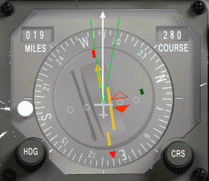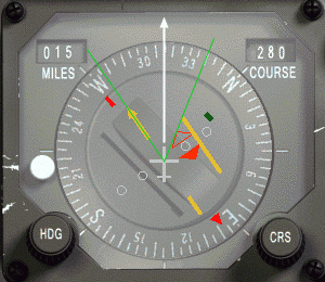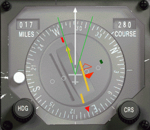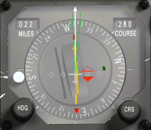 Pak je zde rada k velmi přesnému zachycení radiálu. Soustřeď se na malou ikonu letadla ve středu HSI představující tvoje letadlo. Jestliže protáhneš linku před tvé letadlo podél jeho osy, nakreslíš svou dráhu letu (bílá šipka). Pak by tato linka měla vždy zůstat uprostřed mezi CDI a šipkou kurzoru (zelené linky), budeš-li neustále zatáčet se svým letadlem, až budou tato tři linky dokonale srovnané a pak letíš do perfektního zachycení.