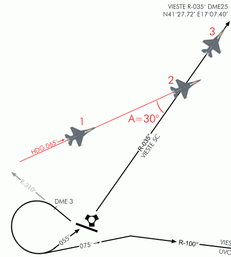 V obecném létání se učí zachytit radiál s 30° přibližovacím úhlem. Ten opravdu poskytuje pilotovi dost času, aby viděl začátek pohybu CDI směrem k středu HSI a pak finální obrat bude jemný. Zde uvidíme, jak to dělat s použitím stále stejného příkladu: