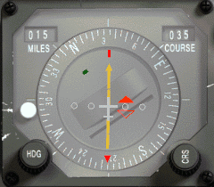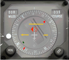 Jak víme, červená šipka míří k vybrané stanici, a jak se blíží radiál 035, šipka se bude posunovat směrem k šipce kurzoru (k hrotu nebo ocásku v závislosti jestli radiál je nastaven pro odlet nebo přílet). Když jsi na radiálu, červená šipka bude srovnána se žlutou linkou (pravý obrázek prostřední řady). Jakmile jsme propásli radiál v tomto příkladu, červená ručička bude pokračovat směrem dolů, jak Tacan pokračuje do našeho zadního pravého kvadrantu.
