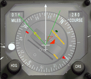 Zachytili jsme R-280 odchozí, znamená to, že sledujeme radiál vycházející ze stanice. Víme, že nejsme příliš daleko od radiálu podle pozice červené směrové šipky, blízko kurzorové šipky u jejího ocásku, a jsme 14 DME od stanice. Zachycení začíná s úhlem 45° dle levého obrázku. Jakmile se CDI začne pohybovat, úhel mezi zelenými linkami se bude zmenšovat. Trik je udržet bílou šipku blízko středu mezi zelenými linkami.