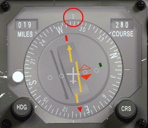 Samozřejmě, že v kabině nemáme zelené linky nebo bílou šipku. Stále v HSI je značka na 12. hodině, která může být použitá jako bílá šipka, ta ti pak bude pomáhat, jak je zobrazeno na obrázku vpravo.