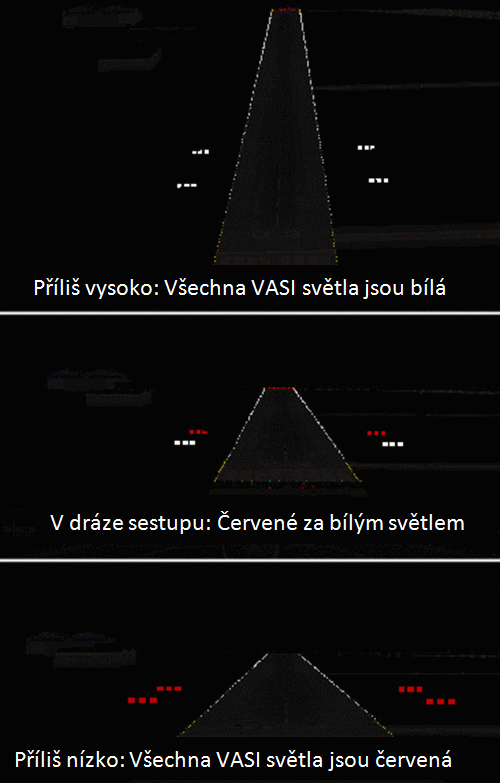 VASI: Vizuální ukazatel sklonu přiblížení. Tento systém se skládá ze dvou signálních pruhů umístěných na každé straně přistávací dráhy. Systém odráží barevné světla podle tvé pozice na 3° dráze sestupu. Pilot by se měl pokusit letět s letadlem, tak aby vzdálenější pruhy byli červené a bližší pruhy byli bílé. Když všechny pruhy jsou červené, letadlo je pod dráhou sestupu, a když všechny pruhy jsou bílé, letadlo je nad sestupovou dráhou. Zde je mnemotechnická pomůcka pro zapamatování světel VASI: „Červené nad bílými je dobrý – v červených jsi mrtvý“.