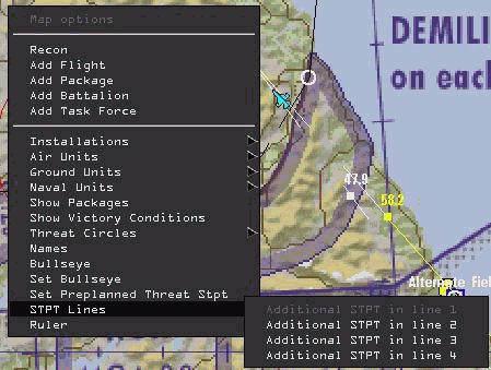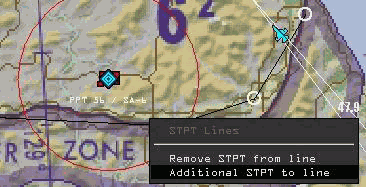 2. Přesuň ho na požadované místo. Další bod (a tím i linie) se přidá opět pravým klikem na první kroužek a volbou “Additional STPT to line”. Druhý bod se objeví přímo na prvním a přesune se přidržením levého tlačítka myši. Anebo můžeš kliknou pravým tlačítkem myši na další požadované místo a vybrat “Additional STPT in line 1” jako na obrázku nahoře a to vykreslí další bod se spojnicí mezi prvním a druhým kroužkem. Na obrázku dole vidíš volbu “Remove STPT from line”, která odstraní steerpoint z části linky.