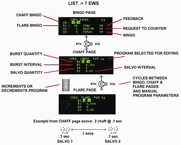 CMDS PGM může být změněna, když je v CMDS CCU přepínač MODE v poloze STBY. Přepnutím přepínače DCS do polohy SEQ, vybereme kategorii obranných prostředků (CHAFF nebo FLARE) pro manuálně vybraný program v pravém horním rohu. Program může být manuálně změněn/zobrazen, s použitím přepínače INC/DEC. Stisknutím DCS nahoru nebo dolů pohybujeme hvězdičkami pro ruční zadání parametrů (burst quantity, burst interval, salvo quantity a salvo interval). Ručně můžou být změněny parametry programů, pro každou hodnotu v následujících limitech: