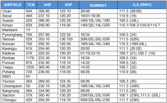 Tato tabulka, je pro přistání na letiště Modrých sil, která zahrnuje Tacan kanály, UHF/VHF frekvence, dostupné vzletové a přitávací dráhy a ILS frekvence. V současné době je vytvořena jen Korea.