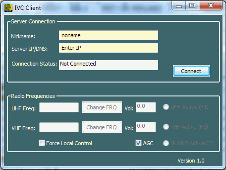 Všimni si, že skupina ovladačů Radio Frequincies je šedá při spuštění aplikace. Tyto ovladače se stanou aktivní, jakmile je úspěšně provedeno připojení k serveru. Jestliže byla vypoužita možnost v příkazové řádce k přednastavení radiové frekvence, měl bys vidět tyto hodnoty v oknech, ale budou stále šedé do té doby, než bude provedeno spojení k platnému serveru.