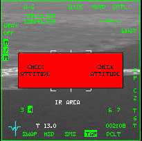 Blikající červený obdelník s dvojitými sadami slov „CHECK ATTITUDE“ je zobrazen na obou displejích MFD (ve všech formátech).