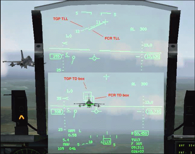 TGP A-A režim umožňuje vizuální identifikaci cíle a sledování A-A cílů. V A-A TGP je nejprve přikaz FCR LOS, jestliže FCR sleduje A-A cíl. Pokud TGP není SOI a FCR nesleduje cíl, TGP LOS je umístěno v kurzu 0 stupňů a –3 stupně výšky. TGP může sledovat a udržovat A-A cíl nezávisle na FCR LOS, vyplívající ze dvojitých A/A TD (značkovač cíle) boxů / TLL’s (naváděcích linek k cíli). Jakmile TGP dostal přikaz k sledování, TGP LOS a FCR LOS jsou nezávislé. TGP LOS je zobrazen jako tečkový 50-mr A-A TD box na HUDu. Když TGP LOS je mimo zorné pole HUDu, je zobrazen tečkovaný TLL a úhel cíle. FCR A-A TD box je pevný 50-mr čtverec.