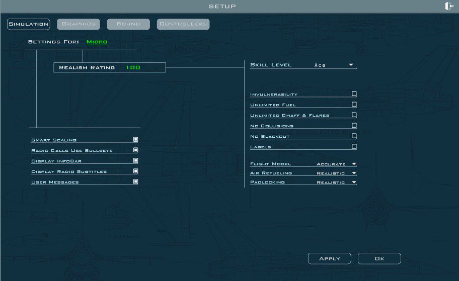 Aby výcvikové mise fungovaly, jak mají, je nutné správně nastavit BMS. V uživatelském rozhraní UI vyber tlačítko SETUP. Ve výchozím nastavení vyber kartu SIMULATION, které potřebujeme. Zkontroluj, zde je vybráno nastavení tvého pilota.