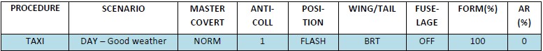 Když opustíš EOR, nastav světlo příďového podvozku na: TAXI. Nastavení vnějšího osvětlení je následující: